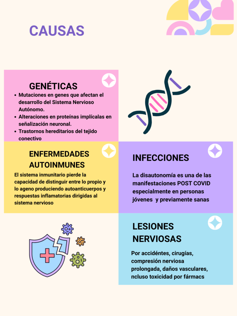 En la disautonomía, este sistema no funciona de manera adecuada, por lo que el cuerpo no se adapta bien a situaciones normales, como ponerse de pie, hacer ejercicio, comer o exponerse al calor.